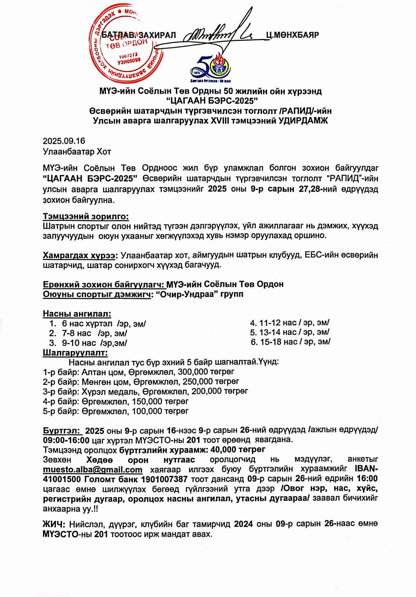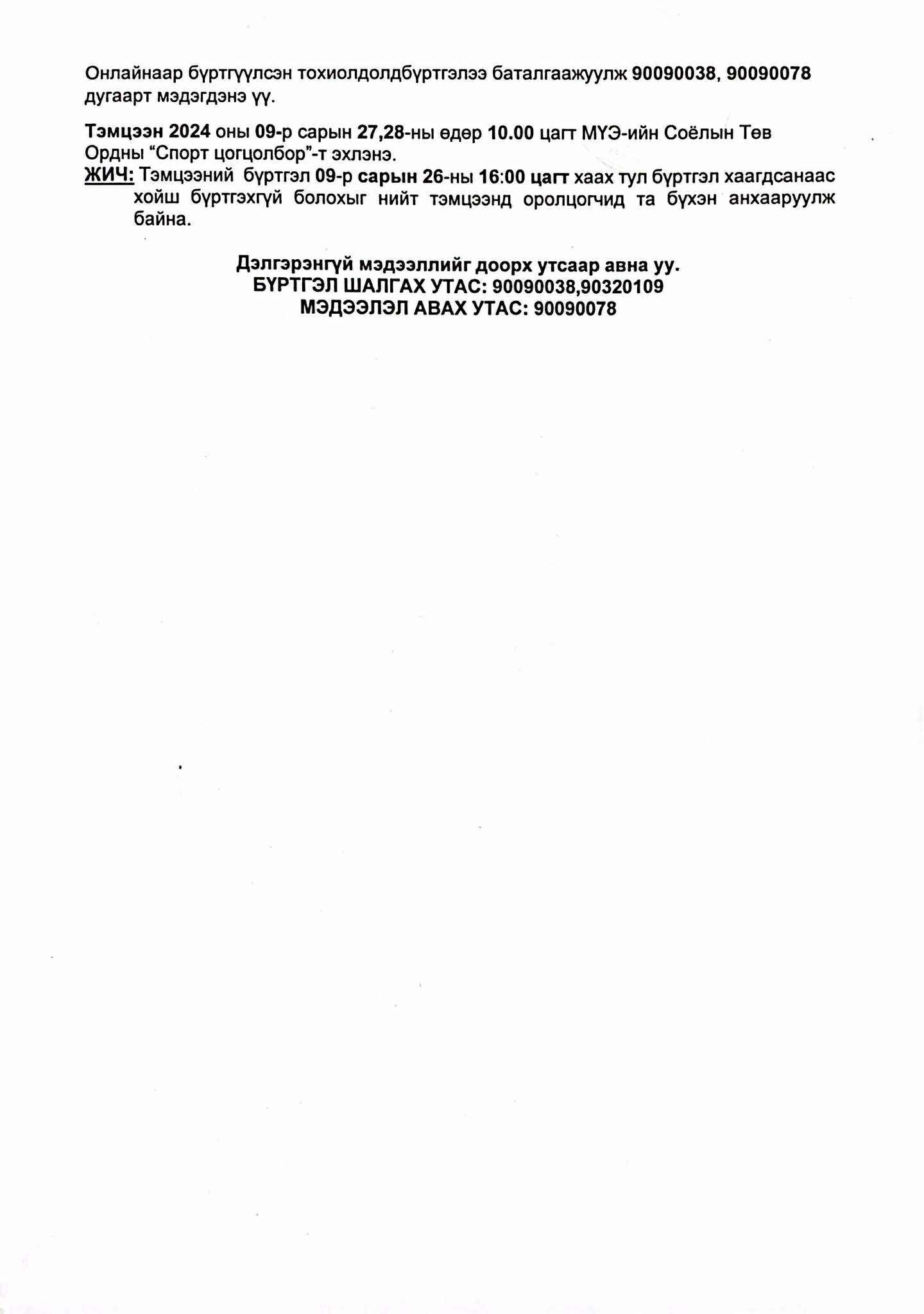 Бүртгэлийг 2025.09.26-ны 16 цаг хүртэл МҮЭ-ийн Соёлын Төв Ордны #201 тоотод хийнэ.